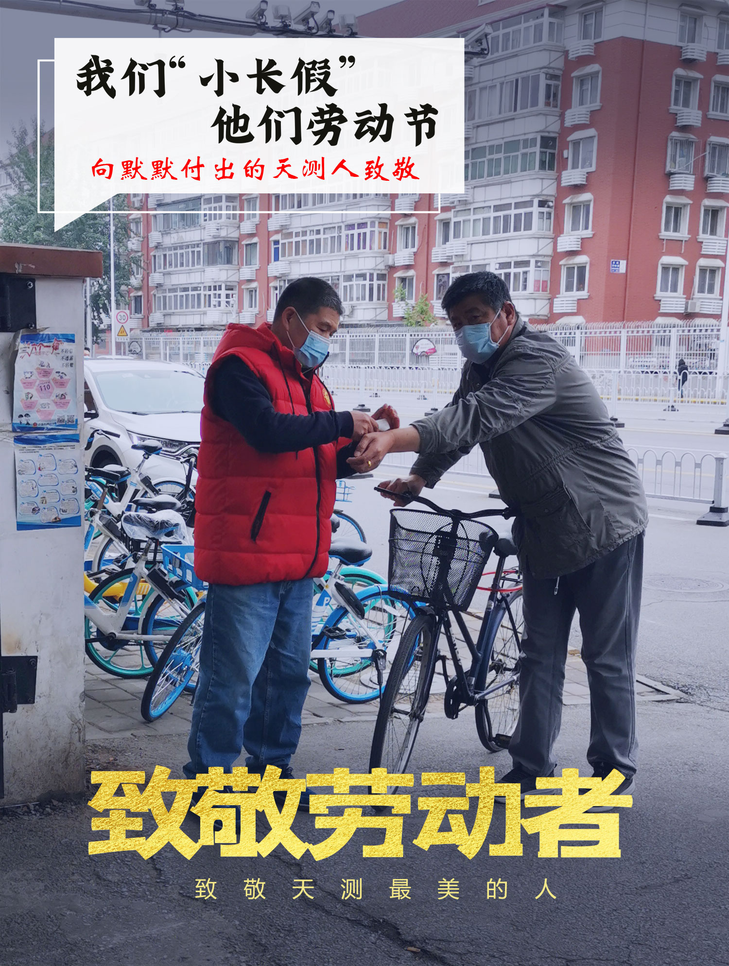 机关第二党支部王建国,五一劳动节假期每天都在邵公庄街道幸福里小区值守。(图为王建国正在给小区居民测量体温)