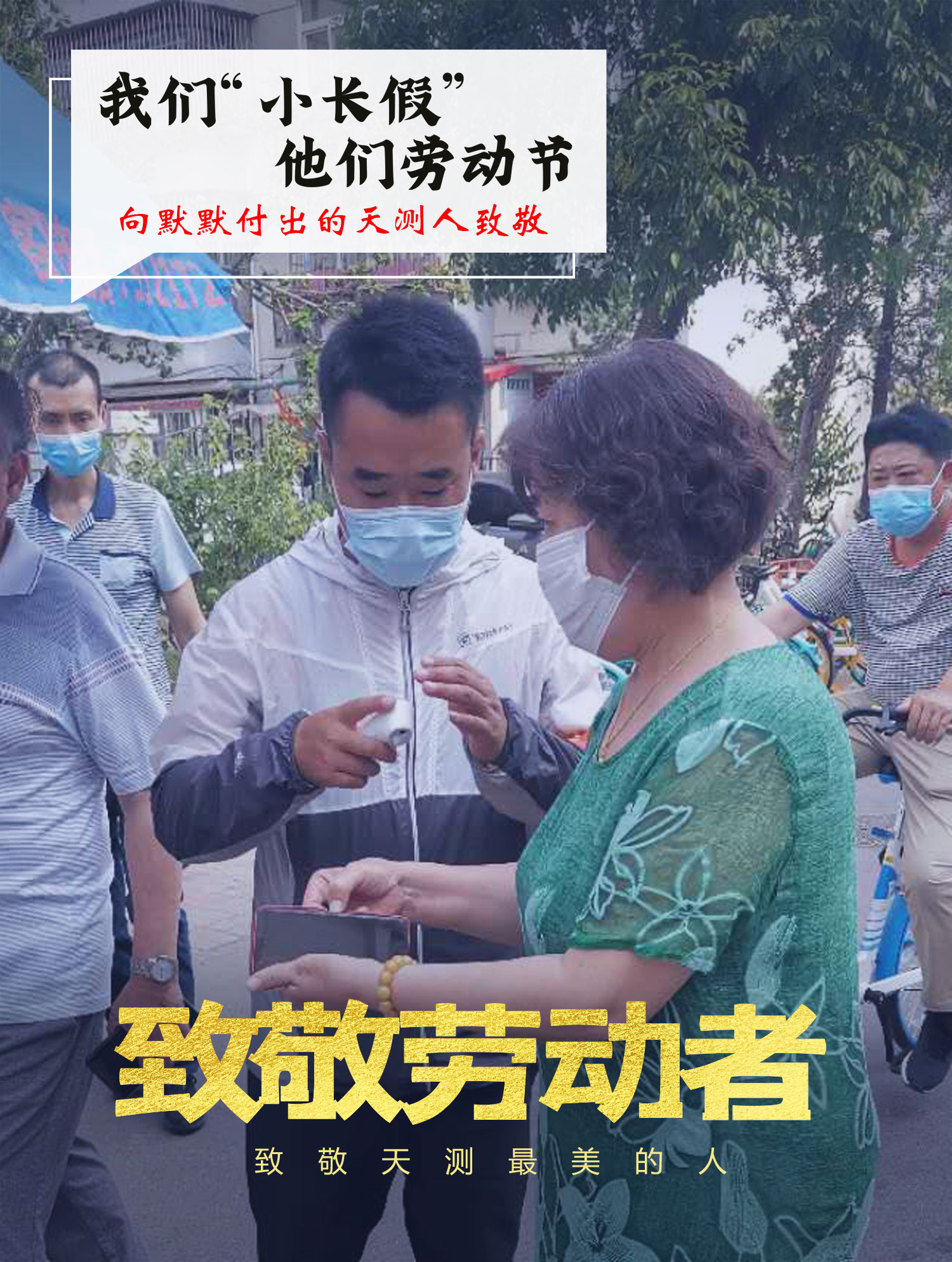 基础测绘院党支部王勇,已经连续两个月在如皋里小区执勤,五一劳动节假期也没有休息。(图为王勇正在给社区居民测体温)