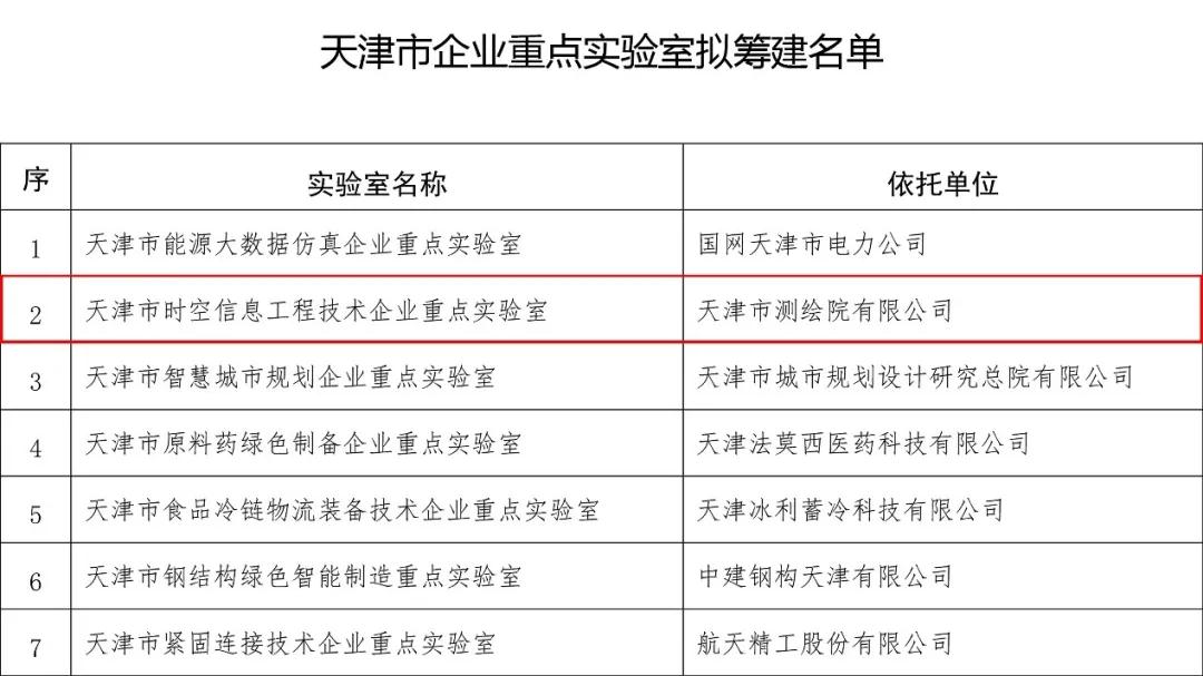 2020年12月30日,天津市科技局公布了2020年批准筹建天津市企业重点实验室名单(已过公示期),由天津市测绘院有限公司申报的天津市时空信息工程技术企业重点实验室在列,这也是天津市首家测绘地理信息技术领域的企业重点实验室。