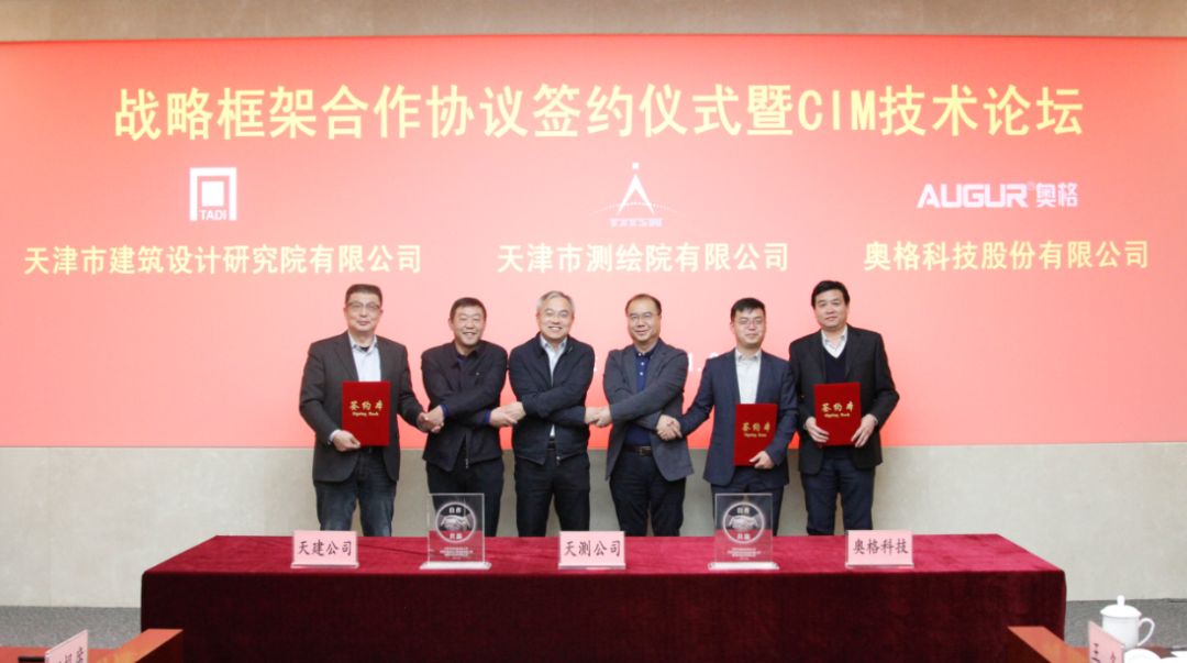 1月25日,为共同谋划城市信息模型智能应用,推动数字孪生建设更好地服务天津城市发展,天津市测绘院有限公司、天津市建筑设计研究院有限公司、奥格科技股份有限公司举行三方CIM战略合作协议签约仪式暨技术交流论坛。天测公司党委副书记、总经理盛中杰、副总经理刘玉财,天建公司执行董事、总经理马华山、副总经理王一心,奥格科技轮值总经理唐伟平、副总经理郭源泉及三方相关技术专家共同出席了签约仪式。