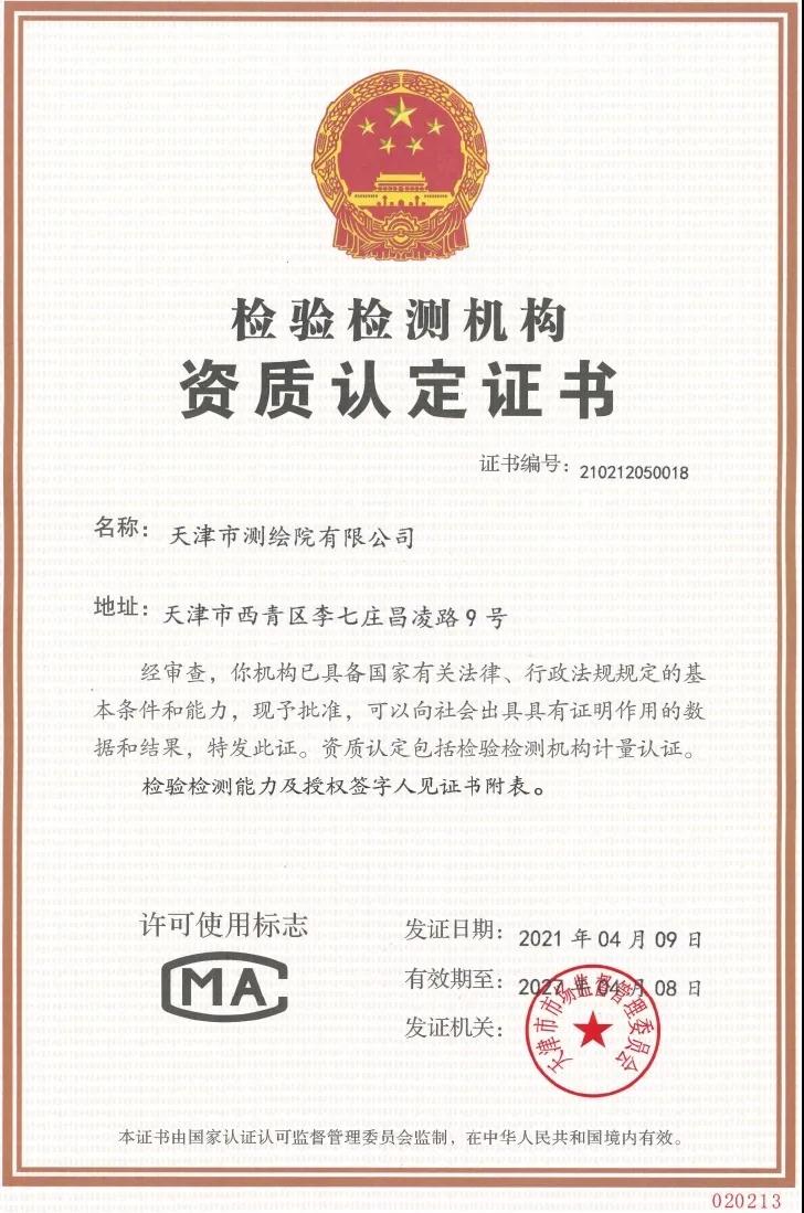 4月9日,天津市测绘院有限公司环境检测实验室顺利取得《检验检测机构资质认定证书》。