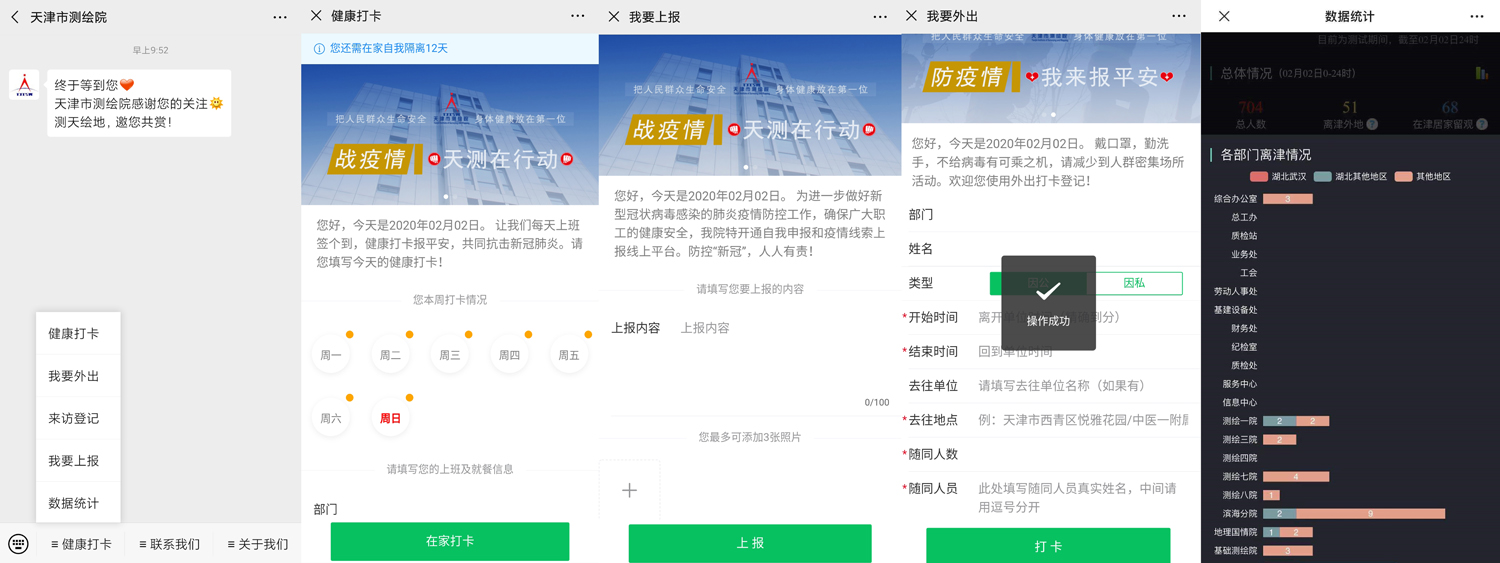 防疫防控软件包含健康打卡、情况上报和数据统计等多项功能,能够全面及时掌握我院在防疫防控时期的职工健康情况、工作情况以及来访人员情况等,科学支撑院防疫防控各项工作,下一步计划还将进一步完善成信息化产品,在政府部门、街道社区管理等方面应用推广,力争为全市防疫防控工作做出天测人更大的贡献!