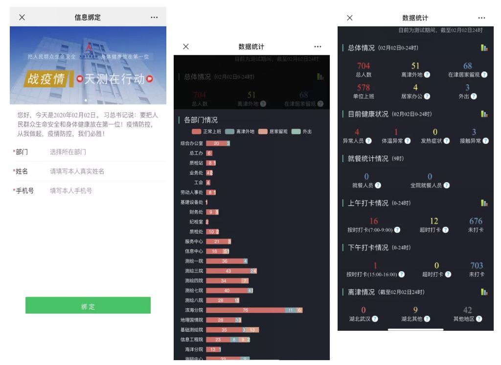 天津市测绘院大年初九上班的第一天,每个职工只花不到30秒的时间就完成了健康打卡,借助系统统计功能,实时汇总出单位整体情况和各项详细信息,并通过推送的方式,将汇总后的信息及时发送给相关领导,每一个职工的体温情况、活动情况一目了然。