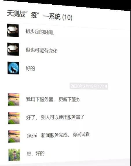 团队成员纷纷献计献策,分享自己的经验、技术和资源,毫无保留、全力以赴。他们中有的人爱人在社区或者交通枢纽执勤,处于防疫需要24小时不归,他就白天照顾嗷嗷待哺的孩子,等孩子睡觉了或者晚上抓紧时间编写代码。
