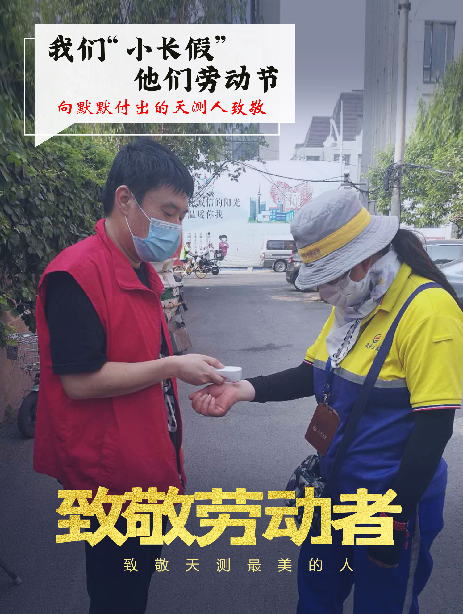 机关第二党支部王建国,五一劳动节假期每天都在邵公庄街道幸福里小区值守。(图为王建国正在给小区居民测量体温)