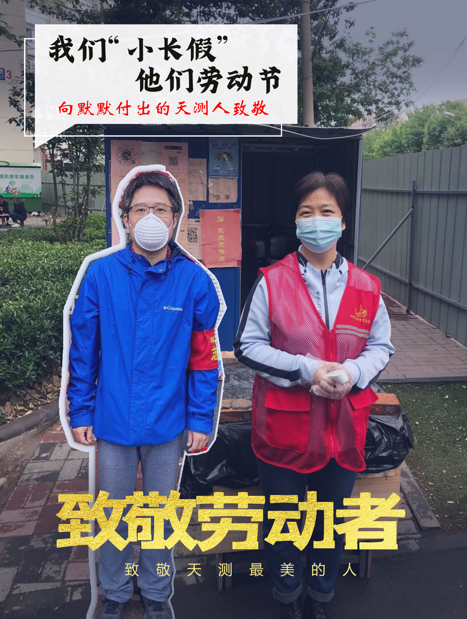 测绘七院党支部曹芳芳、崔鹏两人一同坚守在建新一社区,一个岗位两位同志,共同守护居民健康。(左:曹芳芳 右:崔鹏)